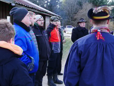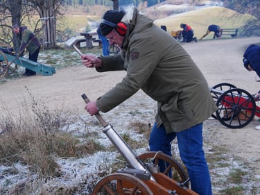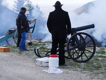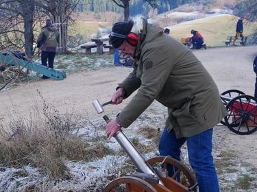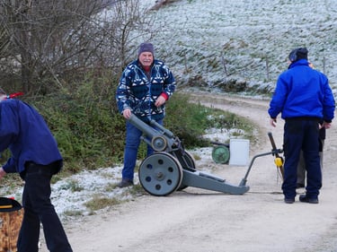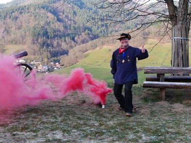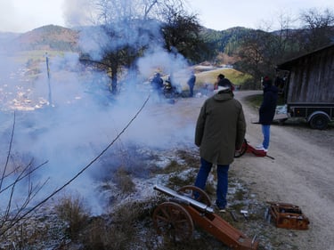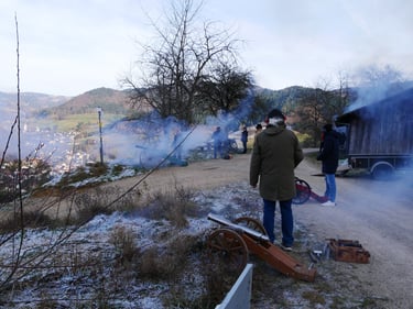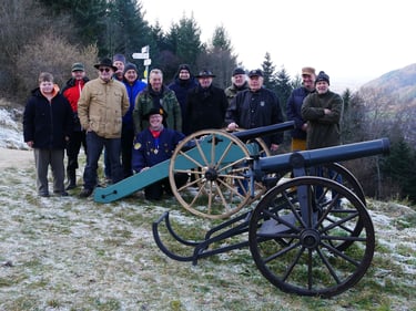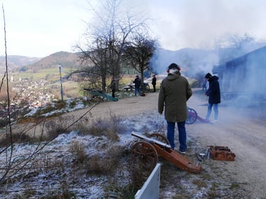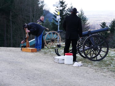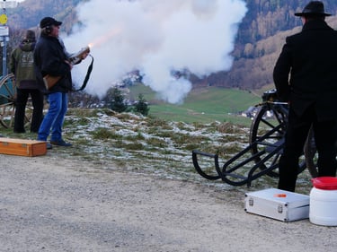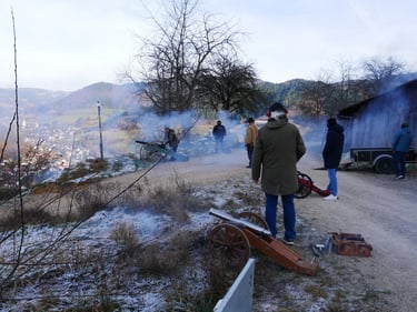 Zum traditionellen Neujahrsböllern unserer Böllergruppe trafen sich am 01.01.2026 13 Böllerschützen aus den Vereinen Münstertal, Müllheim, Ihringen, Heitersheim und Weil am Rhein auf dem Köpfle im Münstertal. Pünktlich um 15 Uhr halte das Echo des ersten Saluts von 6 Kanonen, Schaft- und Standböllern durch das Tal.